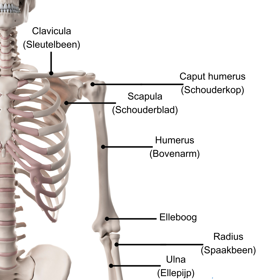 Om het herstel van je gebroken bovenarm beter te begrijpen, is het nuttig om te weten hoe de anatomie van je bovenarm is opgebouwd. Grenzend aan je bovenarm zijn de schoudergordel en het ellebooggewricht beiden complexe gewrichten waar naast botstukken ook veel spieren, pezen en banden aanwezig zijn. Omdat dit eBook specifiek gaat over herstel van een humerusfractuur wordt voor de helderheid nu alleen de anatomie van de botten van de schoudergordel en het ellebooggewricht weergegeven.