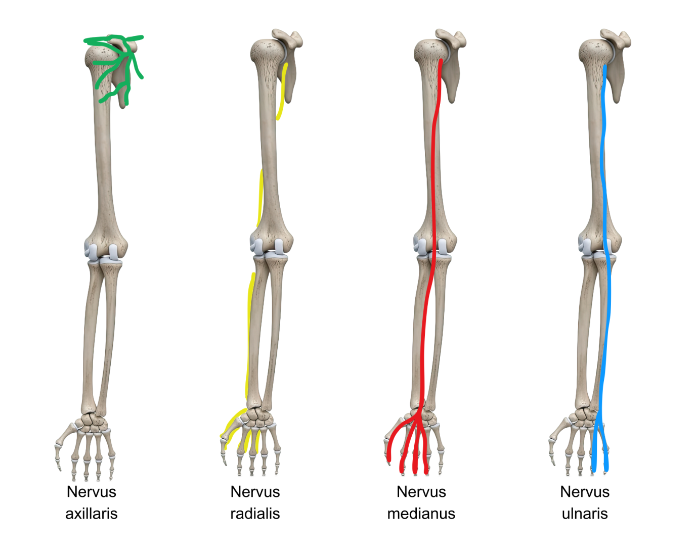Loopt langs de achterkant van de humerus en kan beschadigd raken bij een schachtfractuur. Symptomen zijn verminderd gevoel op de handrug en onderarm en krachtsverlies in de hand. In ernstige gevallen ontstaat een zogenoemde dropping hand, waarbij het strekken van de pols niet meer lukt. - Nervus medianus